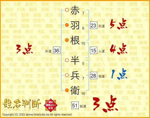 赤(7画)羽(6画)根(10画) 半(5画)兵(7画)衛(16画)