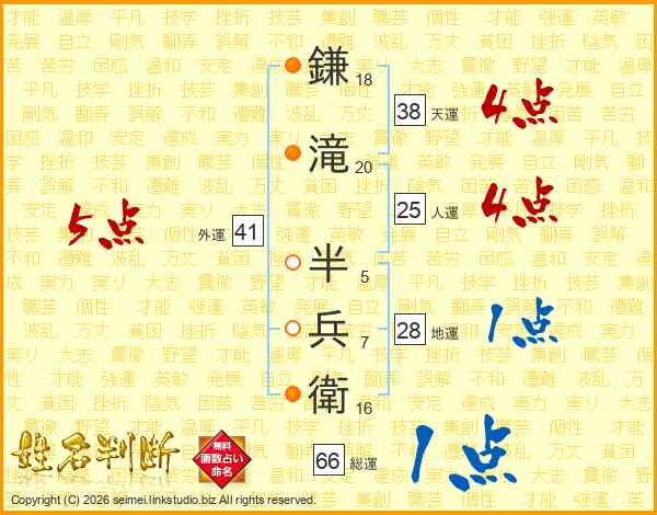 鎌(18画)滝(20画) 半(5画)兵(7画)衛(16画)