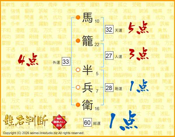 馬(10画)籠(22画) 半(5画)兵(7画)衛(16画)