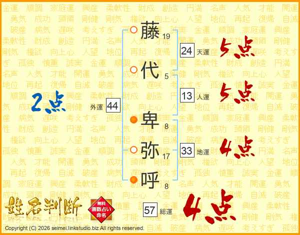 藤(19画)代(5画) 卑(8画)弥(17画)呼(8画)