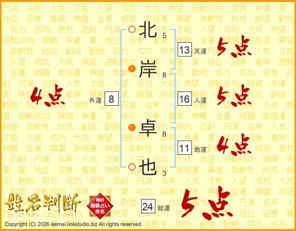 あなたの人生を表す1番重要な運勢です。生涯を通じて影響する総合運となり、主に50歳以降の晩年期に影響を及ぼします。苗字と名前の合計画数。