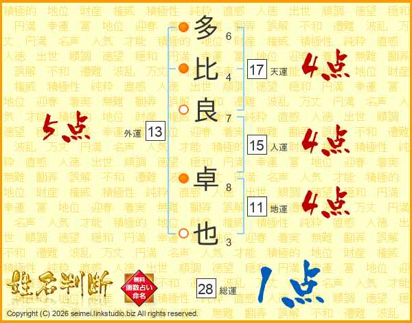 多(6画)比(4画)良(7画) 卓(8画)也(3画)