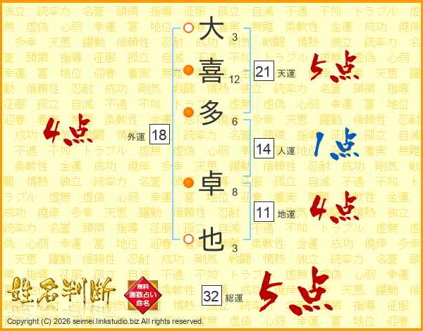 大喜多卓也さんの総運は32画の5点!