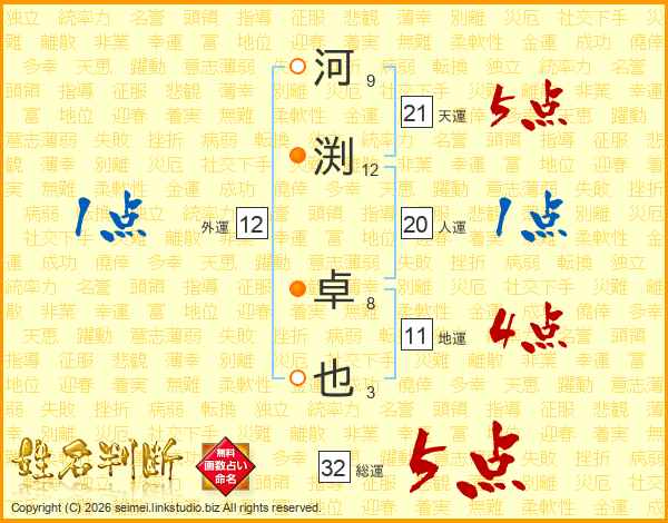 あなたの人生を表す1番重要な運勢です。生涯を通じて影響する総合運となり、主に50歳以降の晩年期に影響を及ぼします。苗字と名前の合計画数。