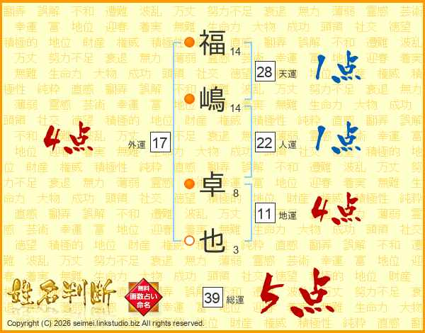 福嶋卓也さんの総運は39画の5点!