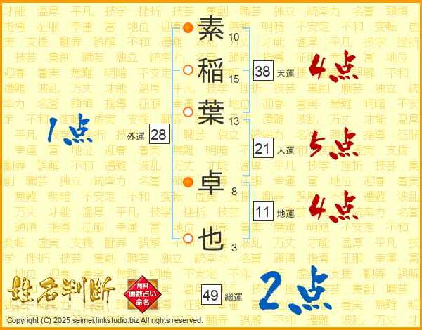 素(10画)稲(15画)葉(13画) 卓(8画)也(3画)