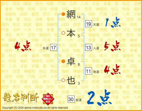 網本卓也さんの人運は13画の5点!