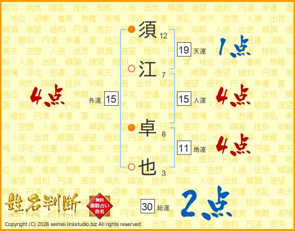 生活面を象徴する運勢です。外部から受ける影響力を表し、結婚運、家庭運や職場、環境への順応性を表します。総運から人運を引いた画数。姓や名が1文字の場合を除く。