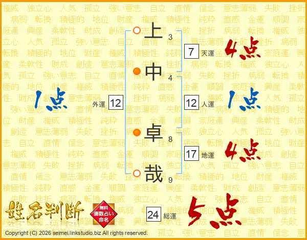 生活面を象徴する運勢です。外部から受ける影響力を表し、結婚運、家庭運や職場、環境への順応性を表します。総運から人運を引いた画数。姓や名が1文字の場合を除く。