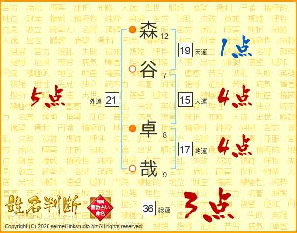 森(12画)谷(7画) 卓(8画)哉(9画)