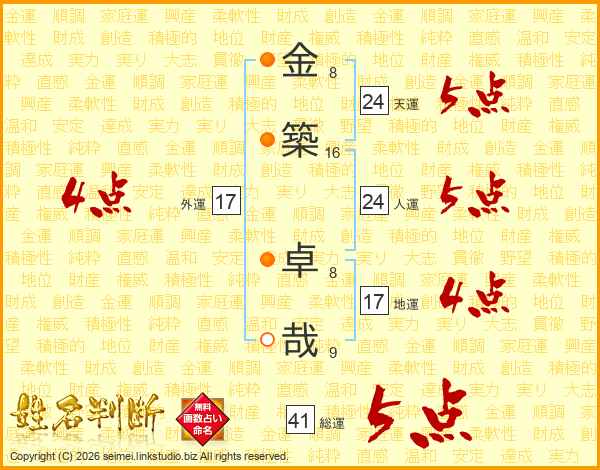 金(8画)築(16画) 卓(8画)哉(9画)