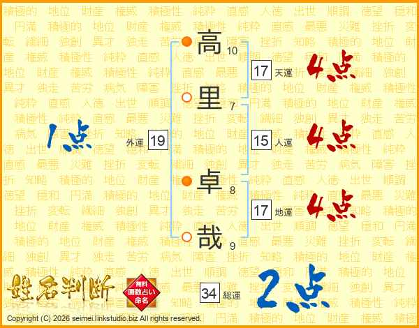 高(10画)里(7画) 卓(8画)哉(9画)