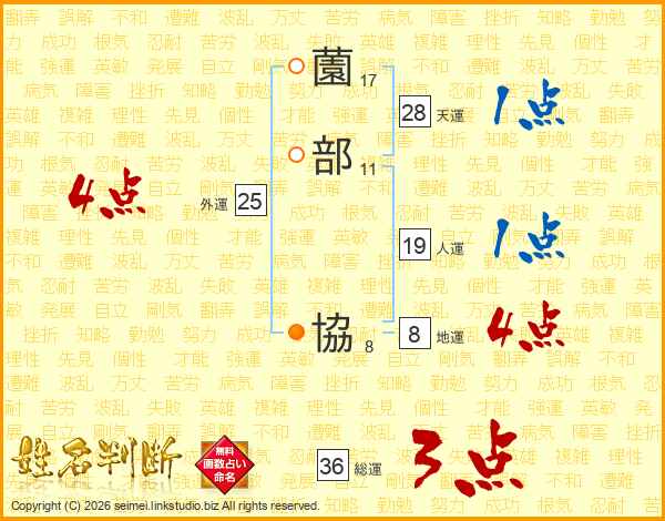 生活面を象徴する運勢です。外部から受ける影響力を表し、結婚運、家庭運や職場、環境への順応性を表します。総運から人運を引いた画数。姓や名が1文字の場合を除く。