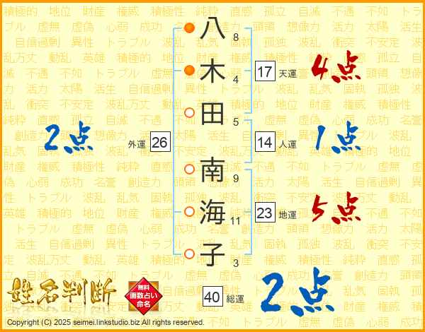 八(8画)木(4画)田(5画) 南(9画)海(11画)子(3画)