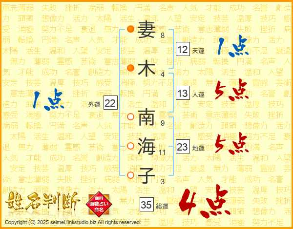 妻(8画)木(4画) 南(9画)海(11画)子(3画)