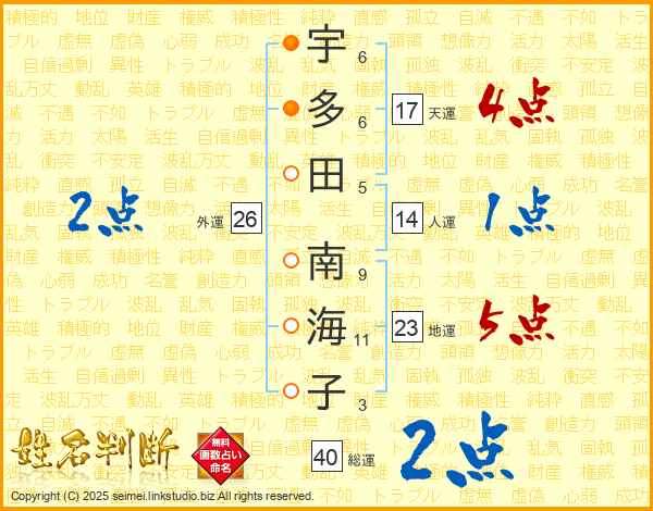 宇(6画)多(6画)田(5画) 南(9画)海(11画)子(3画)