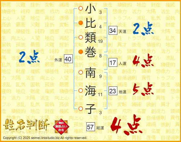小(3画)比(4画)類(19画)巻(8画) 南(9画)海(11画)子(3画)