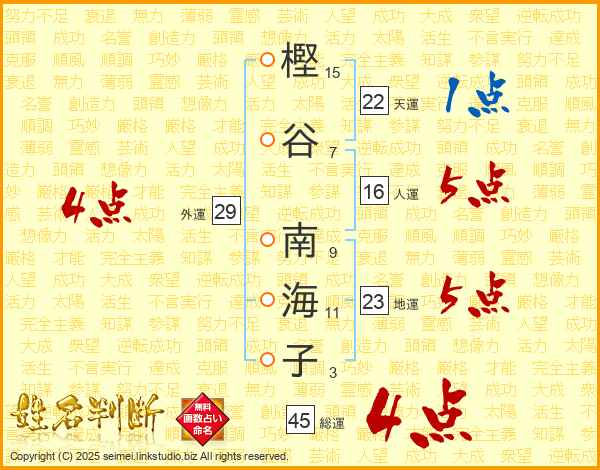樫(15画)谷(7画) 南(9画)海(11画)子(3画)