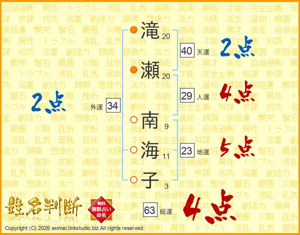 滝(20画)瀬(20画) 南(9画)海(11画)子(3画)