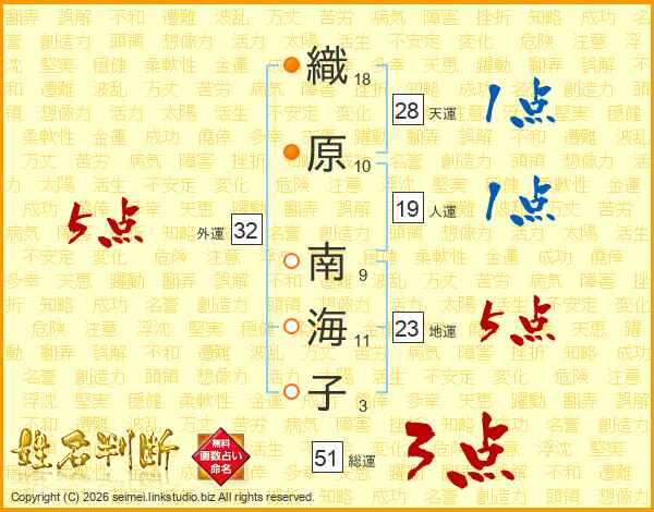 織(18画)原(10画) 南(9画)海(11画)子(3画)