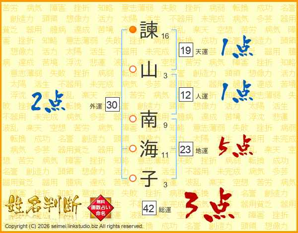 諫(16画)山(3画) 南(9画)海(11画)子(3画)