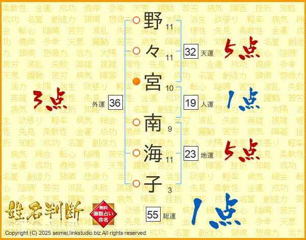 生活面を象徴する運勢です。外部から受ける影響力を表し、結婚運、家庭運や職場、環境への順応性を表します。総運から人運を引いた画数。姓や名が1文字の場合を除く。
