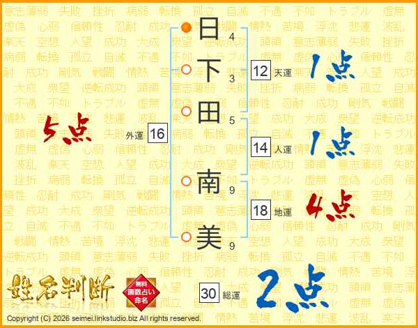 生活面を象徴する運勢です。外部から受ける影響力を表し、結婚運、家庭運や職場、環境への順応性を表します。総運から人運を引いた画数。姓や名が1文字の場合を除く。