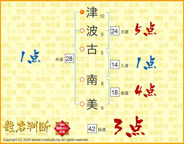津(10画)波(9画)古(5画) 南(9画)美(9画)