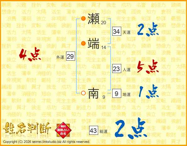 瀬端南さんの総運は43画の2点!