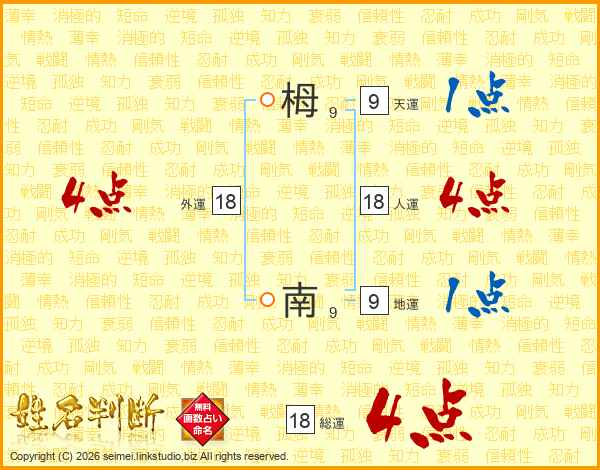 生活面を象徴する運勢です。外部から受ける影響力を表し、結婚運、家庭運や職場、環境への順応性を表します。総運から人運を引いた画数。姓や名が1文字の場合を除く。