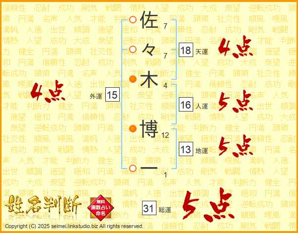 佐(7画)々(7画)木(4画) 博(12画)一(1画)