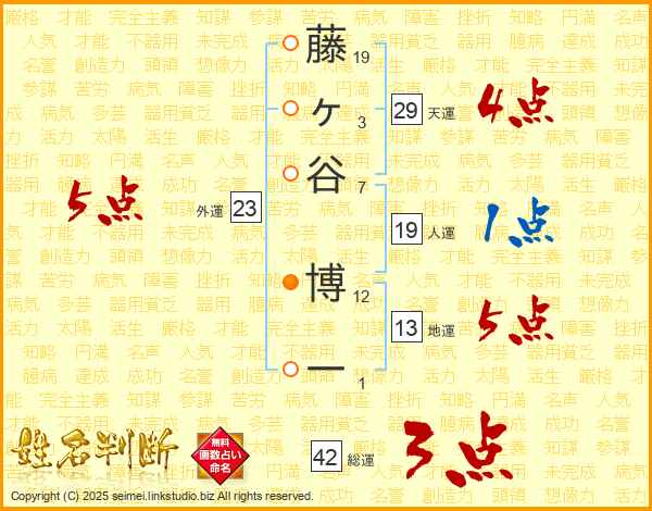 藤(19画)ヶ(3画)谷(7画) 博(12画)一(1画)