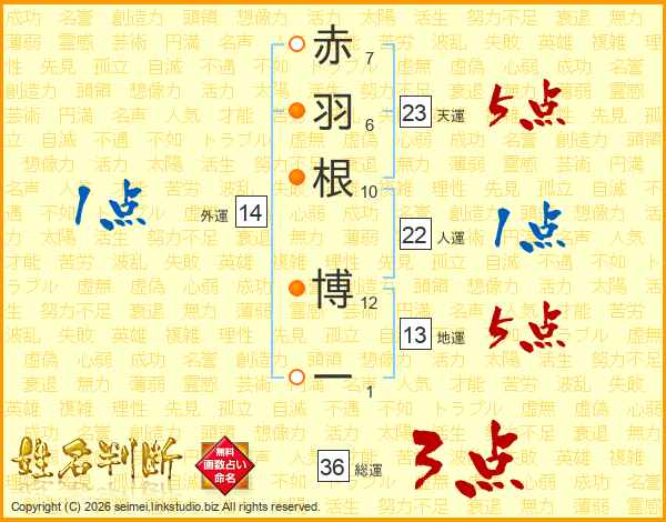 赤(7画)羽(6画)根(10画) 博(12画)一(1画)