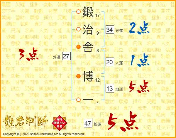 鍛(17画)治(9画)舎(8画) 博(12画)一(1画)