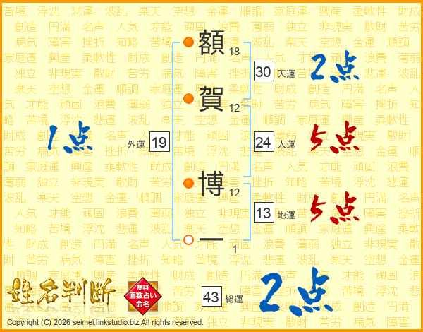 額賀博一さんの天運は30画の2点!