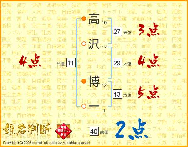 生活面を象徴する運勢です。外部から受ける影響力を表し、結婚運、家庭運や職場、環境への順応性を表します。総運から人運を引いた画数。姓や名が1文字の場合を除く。