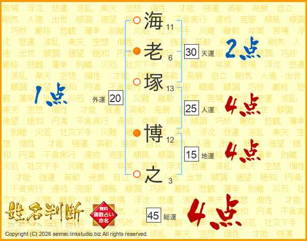 海(11画)老(6画)塚(13画) 博(12画)之(3画)