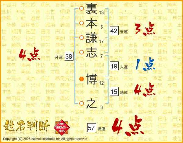 裏本謙志博之さんの総運は57画の4点!