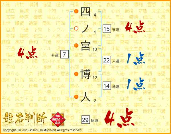 四(4画)ノ(1画)宮(10画) 博(12画)人(2画)