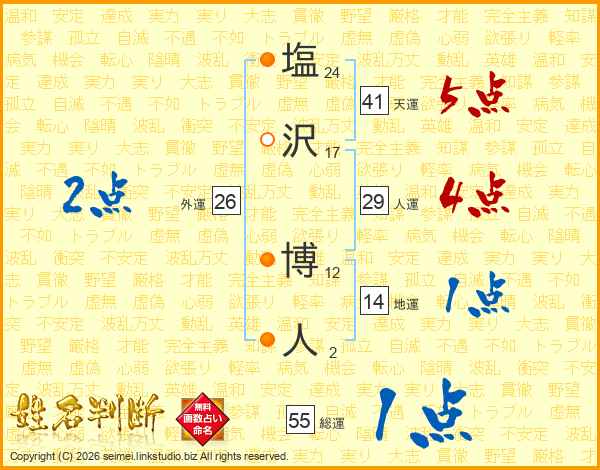 生活面を象徴する運勢です。外部から受ける影響力を表し、結婚運、家庭運や職場、環境への順応性を表します。総運から人運を引いた画数。姓や名が1文字の場合を除く。