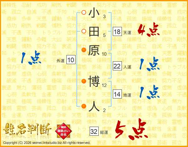 生活面を象徴する運勢です。外部から受ける影響力を表し、結婚運、家庭運や職場、環境への順応性を表します。総運から人運を引いた画数。姓や名が1文字の場合を除く。