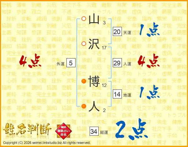 生活面を象徴する運勢です。外部から受ける影響力を表し、結婚運、家庭運や職場、環境への順応性を表します。総運から人運を引いた画数。姓や名が1文字の場合を除く。