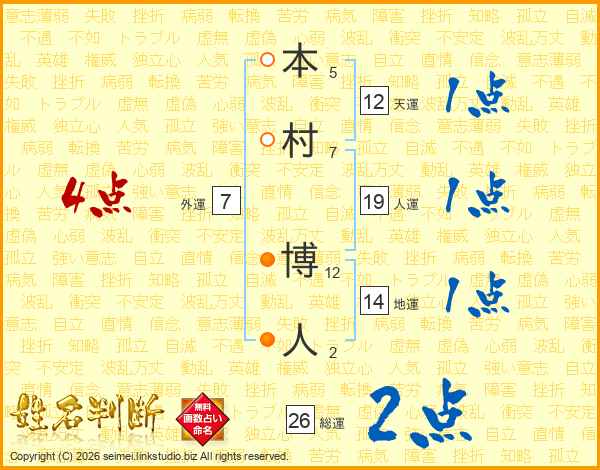 あなたの人生を表す1番重要な運勢です。生涯を通じて影響する総合運となり、主に50歳以降の晩年期に影響を及ぼします。苗字と名前の合計画数。