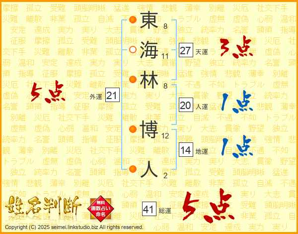 東(8画)海(11画)林(8画) 博(12画)人(2画)