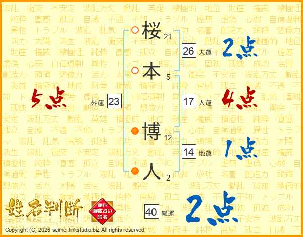 桜(21画)本(5画) 博(12画)人(2画)