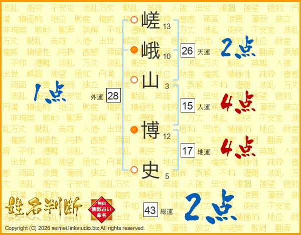 嵯(13画)峨(10画)山(3画) 博(12画)史(5画)
