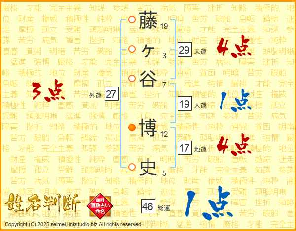 藤(19画)ヶ(3画)谷(7画) 博(12画)史(5画)