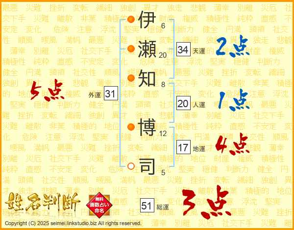 伊(6画)瀬(20画)知(8画) 博(12画)司(5画)