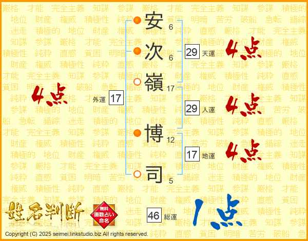 安(6画)次(6画)嶺(17画) 博(12画)司(5画)