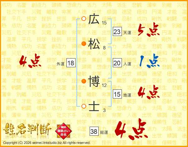 生活面を象徴する運勢です。外部から受ける影響力を表し、結婚運、家庭運や職場、環境への順応性を表します。総運から人運を引いた画数。姓や名が1文字の場合を除く。